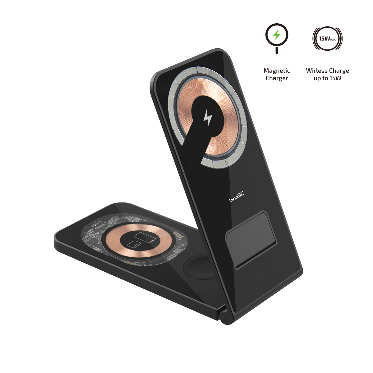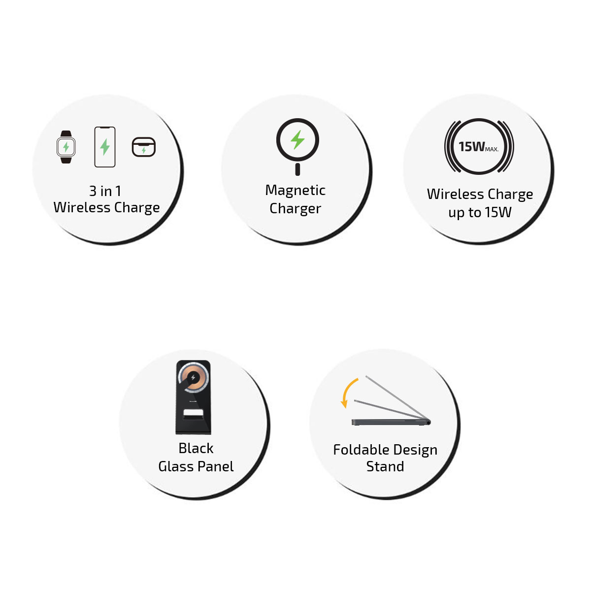 - 3 in 1 folding Magnetic Wireless Charging Stand for iPhone, Apple Watch, AirPods (Only supports models with wireless charging function), which can be wirelessly charged at the same time.