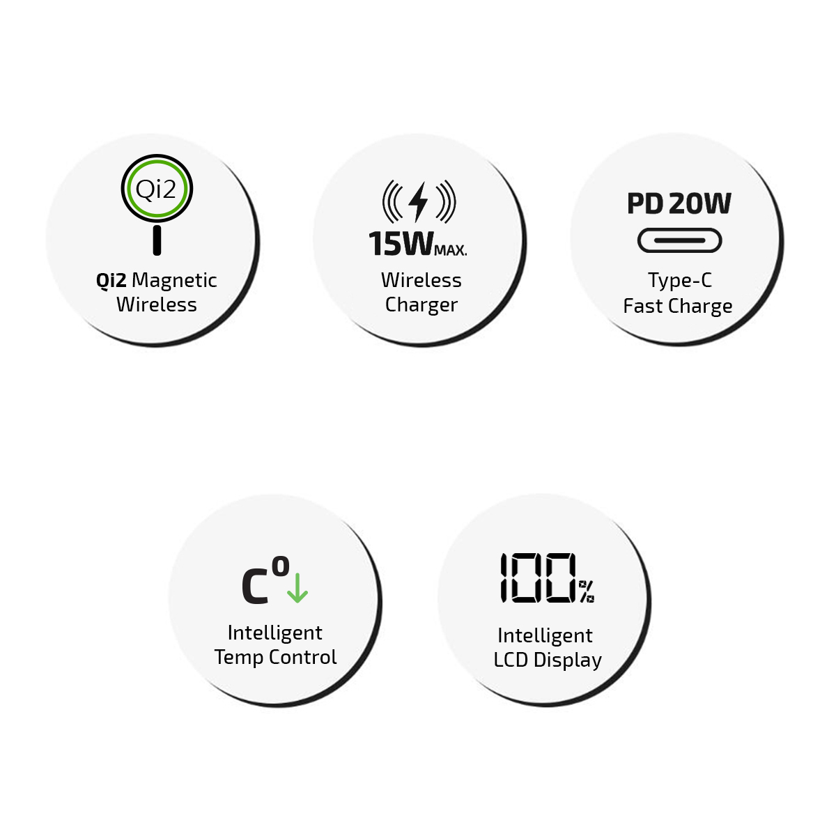 Built-in screen displays the remaining battery and wired/wireless charging power clearly.